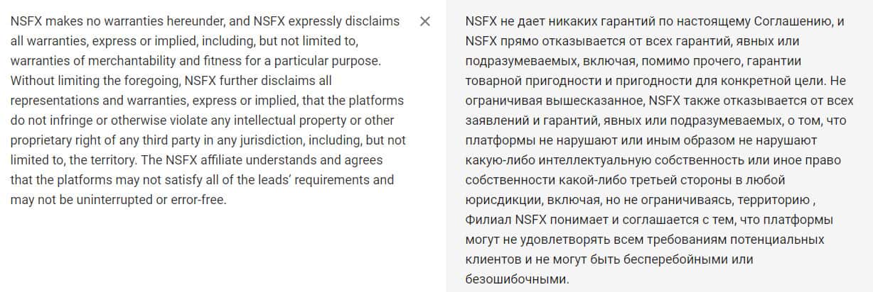 Шарлатанская организация НСФХ Аффилиейтс, также использует свой договор, дабы не узаконить деловые отношения между клиентом и конторой, а для того, чтобы снять с себя ответственность. Тем более, жулье не дает никаких гарантий и прямо отказывается от всего, что они пишут и обещают на своем сайте.