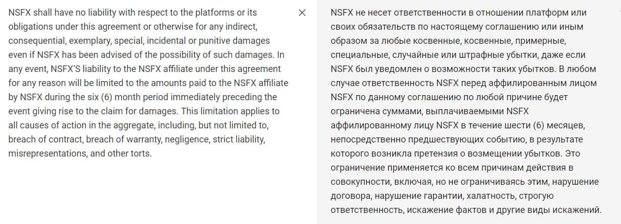 Также мошенники NSFX Affiliates не несут ответственность в отношении торговой платформы, а также по отношению к обязательствам по данному соглашению. В любом случае, если клиент сольет деньги по их вине, то нести ответственность будет сам трейдер. Так что, подписывая договор, вы берете на себя огромный риск.