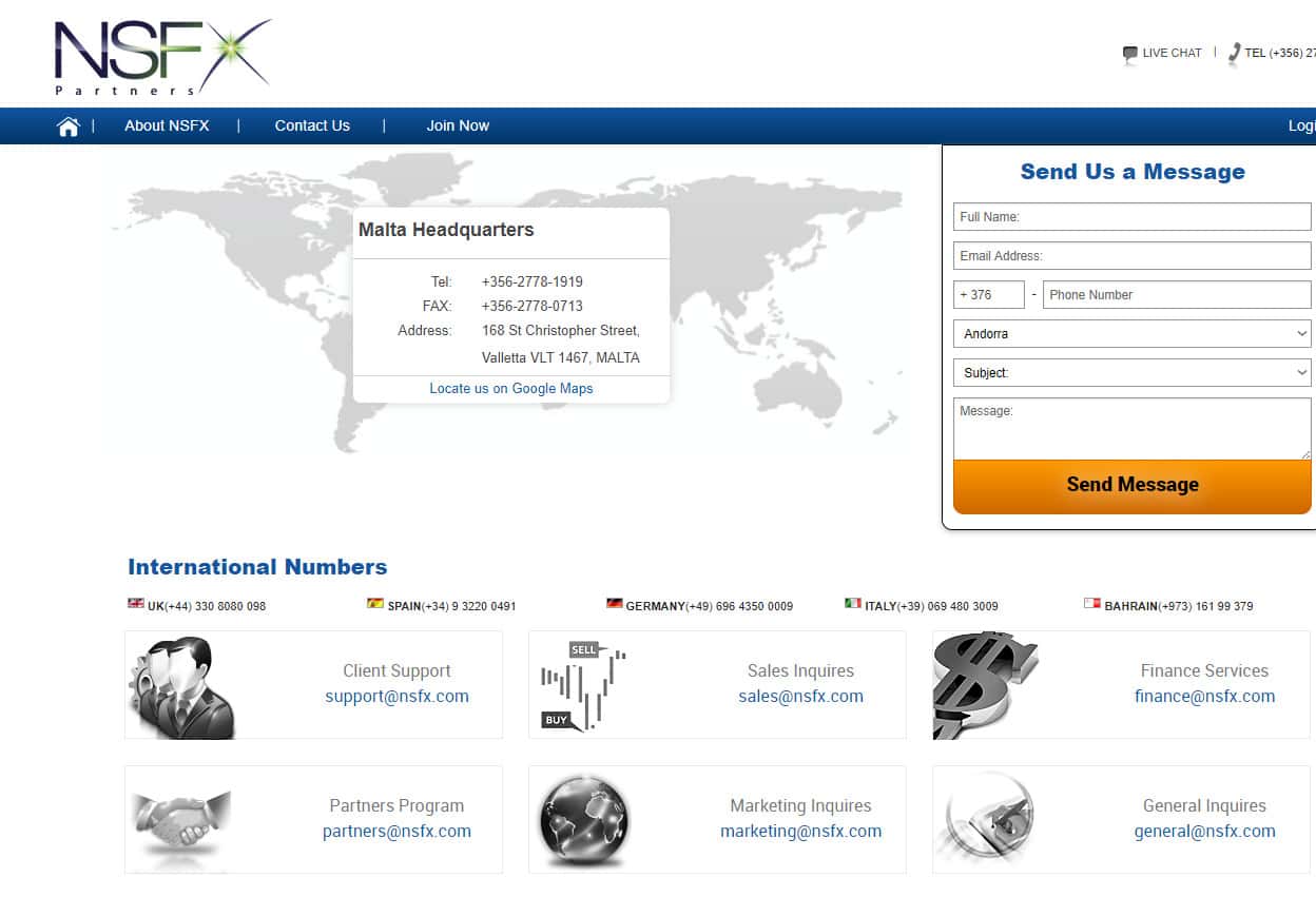 - электронные почты support@nsfx com и sales@nsfx com и finance@nsfx com и partners@nsfx com и marketing@nsfx com и general@nsfx com