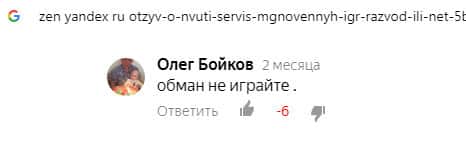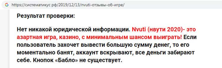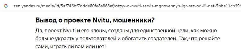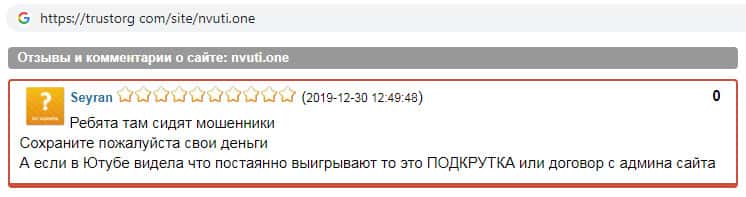 На веб-сайте zen yandex ru отыскан пользовательский комментарий о том, что играть на сайте мошенников Nvuti One нельзя. Связавшись с жуликами необходимо понимать, что Нвути ничего из себя не представляет, это всего лишь игра и развод на деньги. Вероятность выигрыша минимальна.