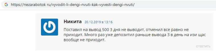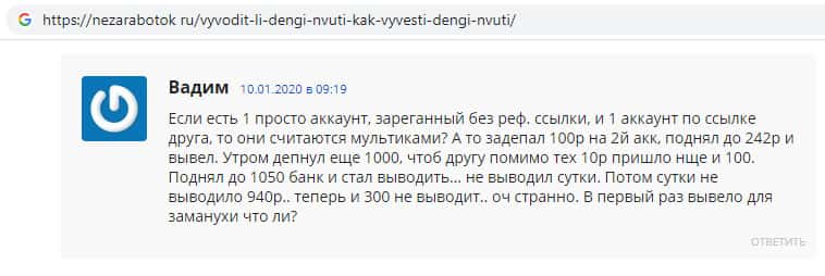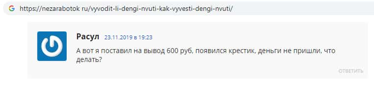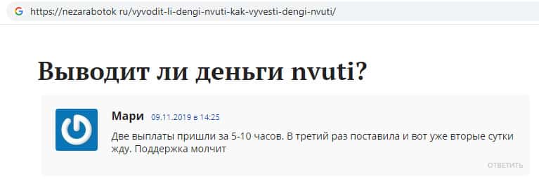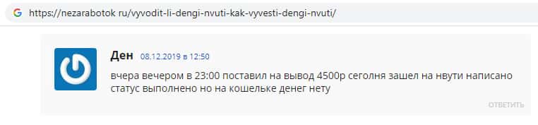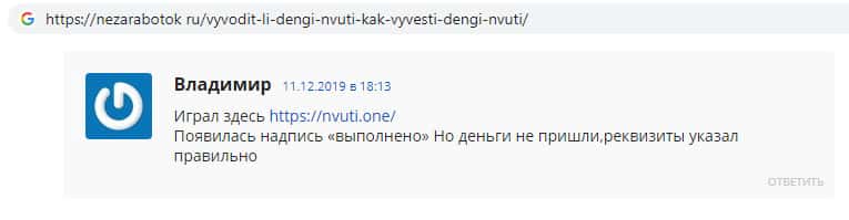 На веб-сервисе незаработок ру найден отзыв некого Владимира, который пишет о мошенниках Нвути следующее: после заявки на вывод денежных средств появилась надпись, будто заявка была выполнена, но на самом деле деньги не вернулись. Аферисты Nvuti One постоянно пользуются данной мошеннической уловкой.
