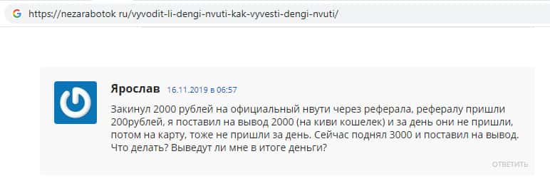 На сайте nezarabotok ru замечен отзыв о мошенниках Nvuti One. При попытке вывести свои денежные средства автор данного отзыва подумал, что вывод был осуществлен, но на самом деле деньги не пришли. Учитесь на чужих ошибках и не связывайтесь с сомнительной конторой Нвути.