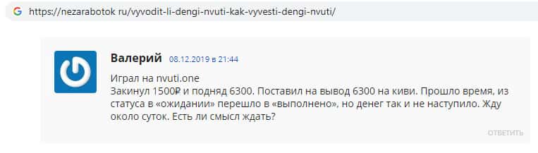 На веб-сервисе незаработок ру найден пользовательский отзыв, автором которого является некий Никита, который связался с шулерами Нвути и убедился, что на их сайте играть совершенно бесполезно. Мошенники Nvuti One не возвращают денежные средства игрокам, которые повелись на развод с их стороны и оставили свои деньги на их дырявом сайте.
