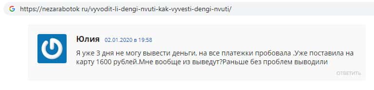 На веб-портале nezarabotok ru обнаружен пользовательский отзыв, автор которого некая Юлия пишет, что раньше получала выплаты, но после того, как на счету осталась немного больше денежных средств, чем обычно, жулики Nvuti One перестали возвращать деньги обратно.