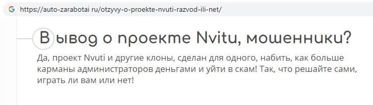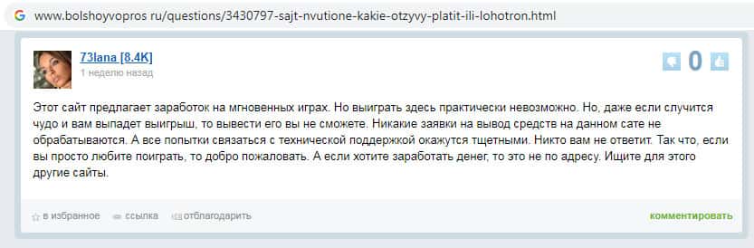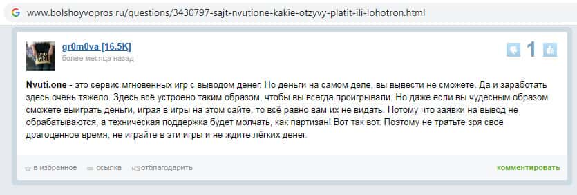 На информационном сайте bolshoyvopros ru отыскан пользовательский отзыв о скам-проекте Nvuti One. Заработать на сайте мошенников тяжело, вывести свои денежные средства крайне тяжело и удается не всем, поскольку аферисты Нвути делают только лишь первоначальные выплаты, после чего кидают игроков сайта.