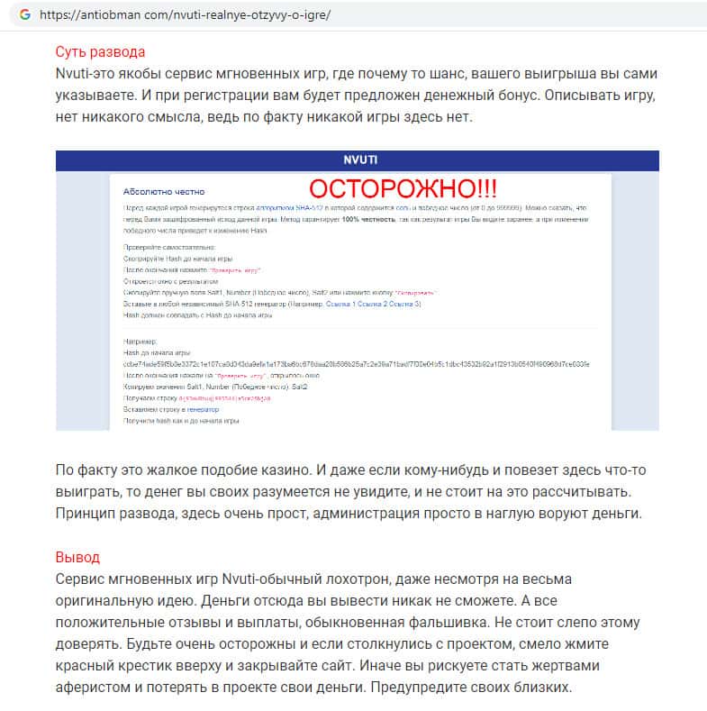 На информационном сайте antiobman com обнаружена статья о том, что необходимо быть осторожными с мошеннической конторой Nvuti One и не играть на их фальшивом сайте. Шанс выигрыша на сайте конторы Нвути не зависит от того, какую ставку Вы поставили. Жулики все равно не вернут Вам деньги.