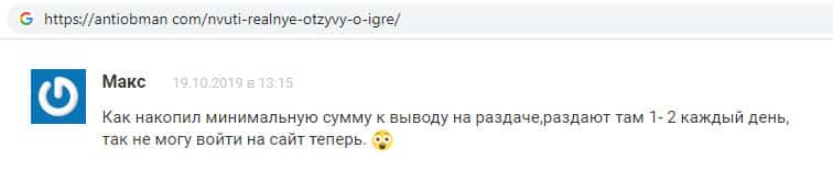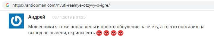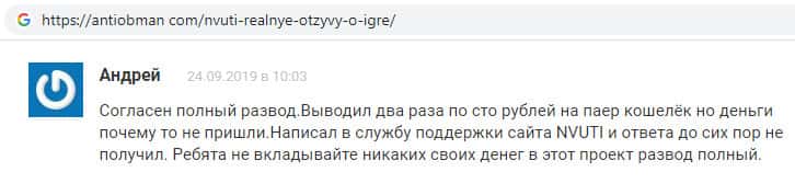 На сайте антиобман ком замечен комментарий некого Андрея о разводе со стороны конторы Нвути. Мошенники берут по минимуму и ждут пока игрок пополнит счет и через какое-то время подаст заявку на вывод. Автор данного отзыва понят, что связался с жуликами лишь после того, как не смог вернуть свои деньги.