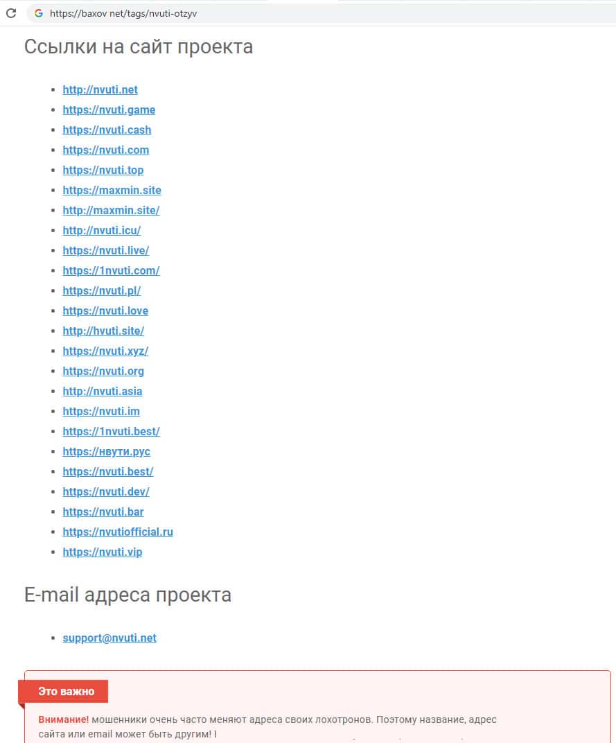 На информационном портале baxov net обнаружена статья о доменах сайта Nvuti One. Жулики слишком часто меняют домен своего сайта, таким образом воруя деньги у игроков на своем сайте и блокируя доступы. После того, как Нвути собирают достаточное количество денег с пользователей своего сайта, сразу же меняют домен, но дизайн сайта остается тот же.