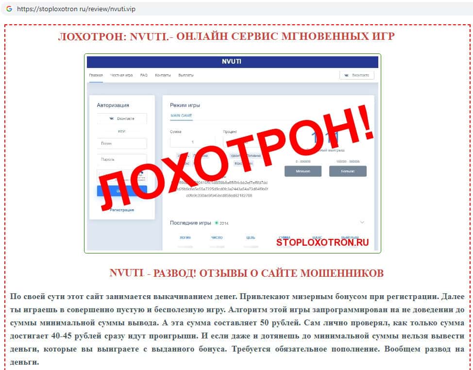 На сайте стоплохотрон ру замечена информация об интернет-лохотроне Нвути. Сайт данной конторы рассчитан на азартных людей, которые верят в бонусы после регистрации, в выплату реальных денег после виртуальной игры. Мошенники Nvuti One не дают никаких гарантий того, что прибыль будет.