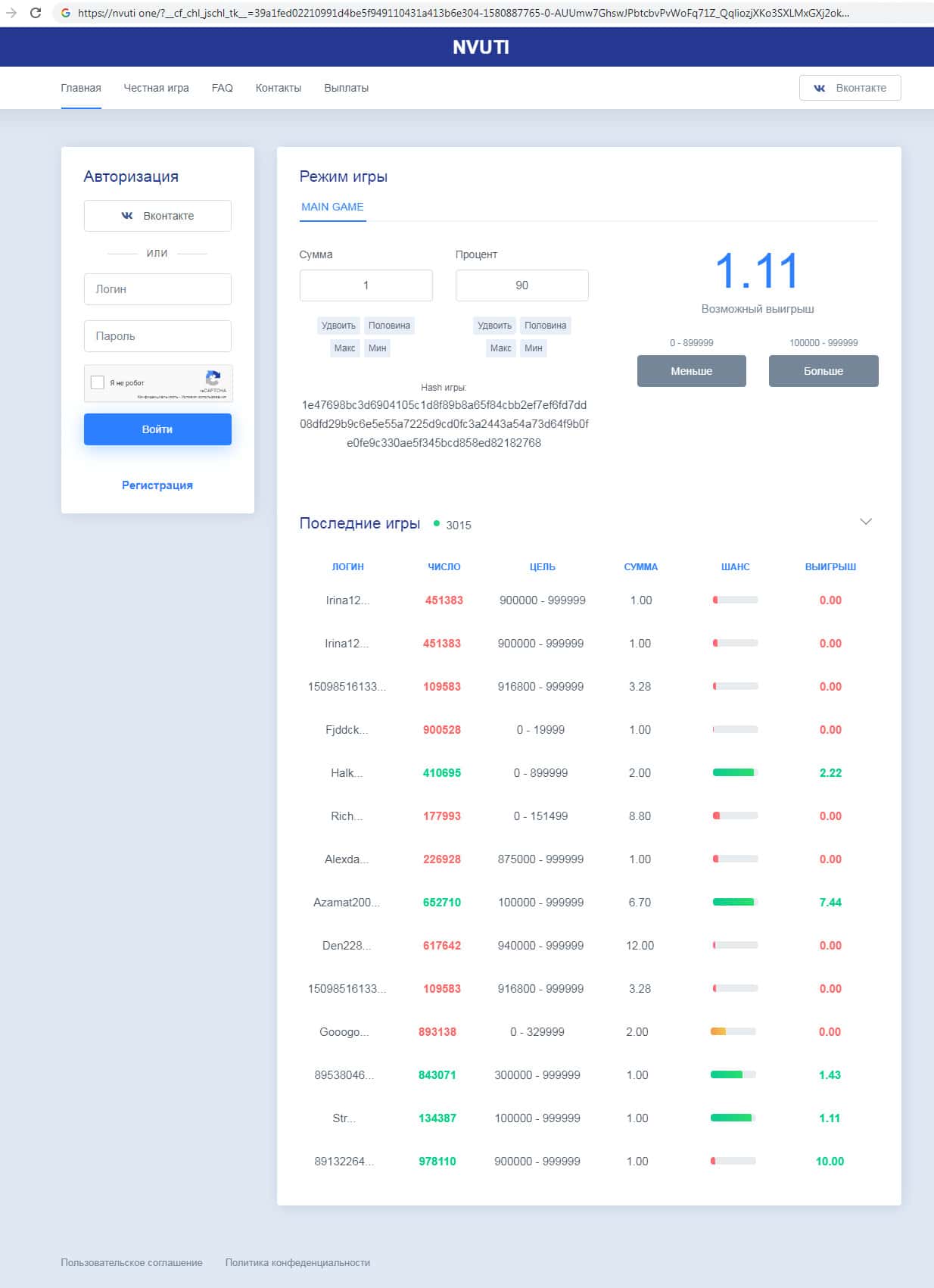Жулики Nvuti One обманывают людей рассказывая сказки о том, что игра на их сайте абсолютно честная и то, что выплаты гарантированы. Обратите свое внимание на то, что при попытке посмотреть дополнительную информацию о конторе, поменялся домен сайта. Это является первым признаком фейкового сайта.