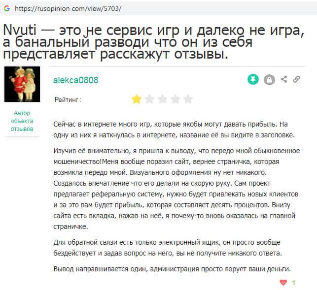 На веб-портале nezarabotok ru был обнаружен отзыв о скам-компании Nvuti One, автором которого является некая Мари, которая пишет о том, что мошенники осуществили лишь первые две выплаты, после чего она поверила в чудо и начала играть дальше. Уже в третий раз аферисты Нвути отказались ей выплачивать денежные средства.