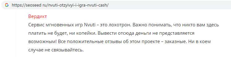 На веб-сайте незаработок ру замечен отзыв о жуликах Нвути, где некий Вадим жалуется на то, что на сайте шулеров смог получить только лишь первую выплату, которую мошенники делают для того, чтобы заманить на свой фальшивый сайт азартных людей. Nvuti One больше зарабатывает на игроках, чем возвращает !!!