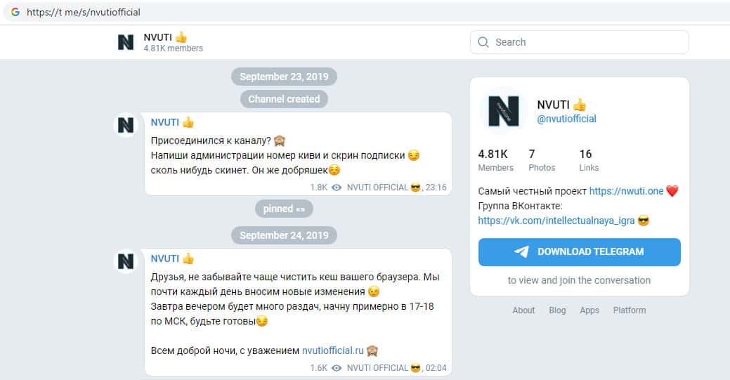 - Шулера Nvuti One так же вовлекают пользователей через Телеграм