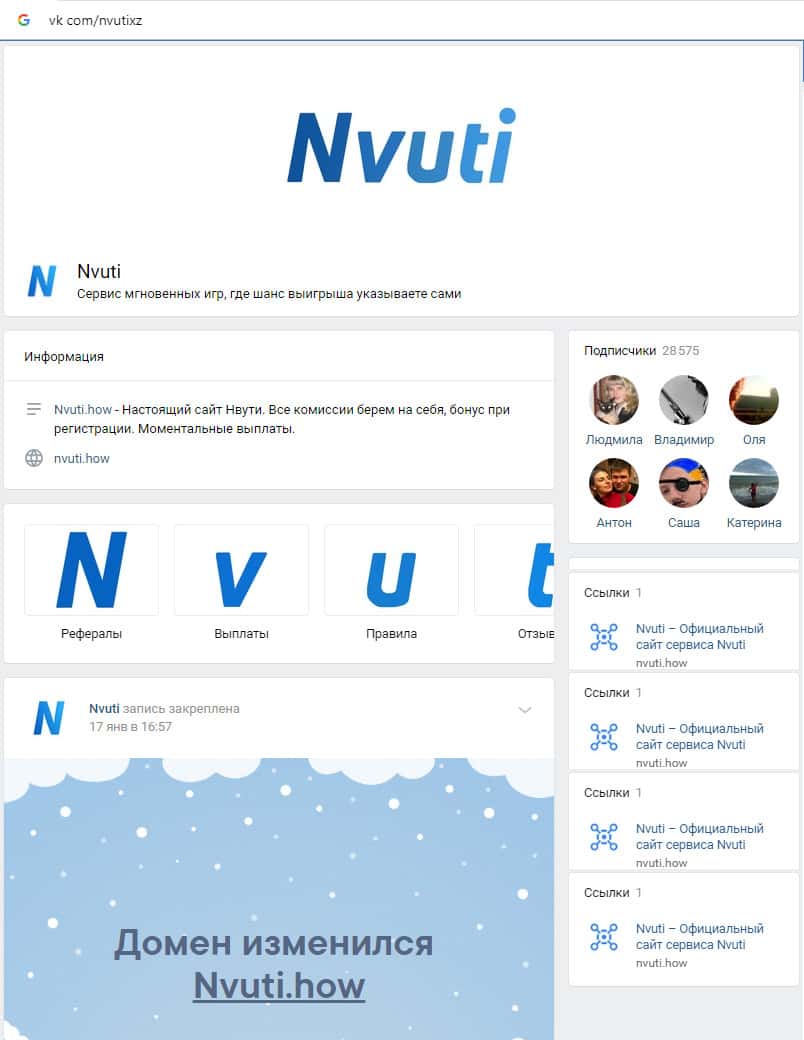 Скам-контора Nvuti One для привлечения как можно большего количества людей решила создать страницу в социальной сети vk com, где мошенники позиционируют свою организацию как сервис мгновенных игр, где шанс выигрыша игрок якобы сам указывает. Просим обратить свое внимание на то, что аферисты Нвути часто меняют домен сайта !!!
