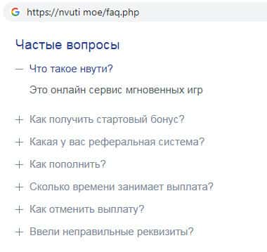 В случае возникновения каких-либо проблем связанных с выводом денежных средств, мошенники Nvuti One всегда будут ссылаться на предлагаемые ответы. Аферисты Нвути аргументируют это тем, что ответы на Ваши вопросы уже прописаны и у них нет такой возможности более подробно отвечать.