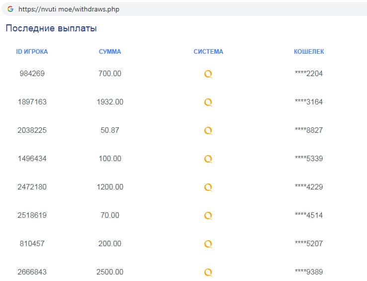 Так же замечен еще один признак фальшивого сайта Nvuti One, таблица с якобы осуществленными последними выплатами. Верить подобного рода информации не имеет смысла, поскольку цифры на сайте аферистов Нвути не меняются. Все, что пишут мошенники на своем сайте - вымысел для наивных людей, которые верят в прибыль из неоткуда.