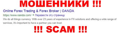 ОАНДА - очередные мошенники сети интернет, которые занимаются наглым разводом наивных пользователей сети интернет под предлогом торговли форекс, в ходе которой жулики OANDA сливают наивным клиентам их денежный счет, после чего оперативно дают заднюю и сливаются. В связи с этим иметь дело с лохотроном ОАНДА определенно не рекомендуем !!!
