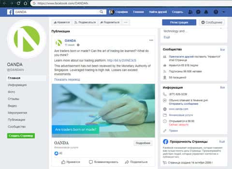 Дабы соответствовать современным трендам аферисты OANDA обзавелись страницами в социальных сетях, одной из которых стал Facebook, где шулера ОАНДА не поскупились и накрутили более полусотни тысяч подписчиков, о чем говорит низкая активность подписчиков. На изображении, расположенном ниже, вы можете увидеть страницу жуликов OANDA в Фейсбук.