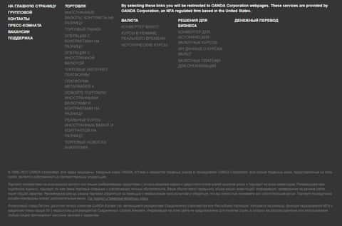 Завершается сайт у аферистов OANDA довольно стандартно, а именно ссылками на различные разделы сайта мошенников ОАНДА, а так же предупреждением о рисках, в которых шулера OANDA говорят о возможной вероятности полной потери средств наивными клиентами. На изображении, расположенном ниже, вы можете увидеть окончание сайта мошенников ОАНДА.