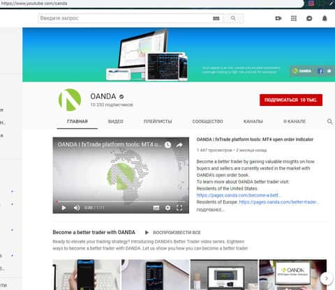Для размещения различных рекламных видеороликов мошенники ОАНДА обзавелись страницей в социальной сети YоuTube, где лохотрон OANDA так же раскошелился накрутить десять тысяч подписчиков на данный аккаунт. На изображении, расположенном ниже, вы можете наглядно увидеть внешний вид страницы мошенников ОАНДА в социальной сети Ютубе.