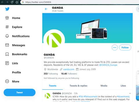 Имеется у лохотрона OANDA и страница в социальной сети Твиттер, где аферисты ОАНДА накрутили более десятка тысяч подписчиков для обеспечения внешнего вида и солидности, однако активность на аккаунте лохотрона OANDA крайне низкая. На изображении, расположенном ниже, вы можете увидеть страницу аферистов ОАНДА в социальной сети Twitter.