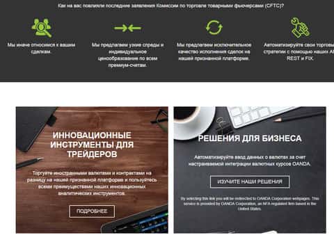 После мошенники ОАНДА размещают еще несколько блоков сайта со своими преимуществами, которыми они хотят подкупить случайных пользователей сети интернет в надежде на то, что они откроют у лохотрона OANDA счет, который мошенники после оперативно заблокируют. На изображении, расположенном ниже, вы можете увидеть данный раздел сайта шулеров.