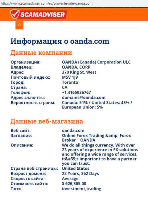 В связи с мошеннической и противозаконной деятельностью аферистов OANDA его руководители предпочитают анонимность дабы избежать ответственности со стороны правоохранительных органов. Информацию о самом сайте мошенников ОАНДА можно узнать с помощью портала scamadviser com, которую вы можете увидеть на изображении, расположенном ниже.