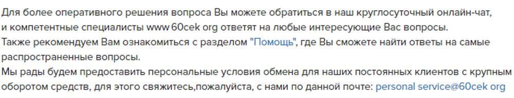 Жулики Обменник 60 Сек предпочитают общаться как можно меньше и решать все вопросы через раздел "Помощь". Но для крупных клиентов предусмотрели отдельный почтовый ящик:
