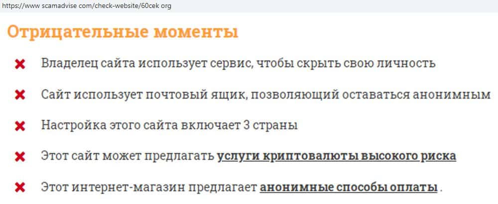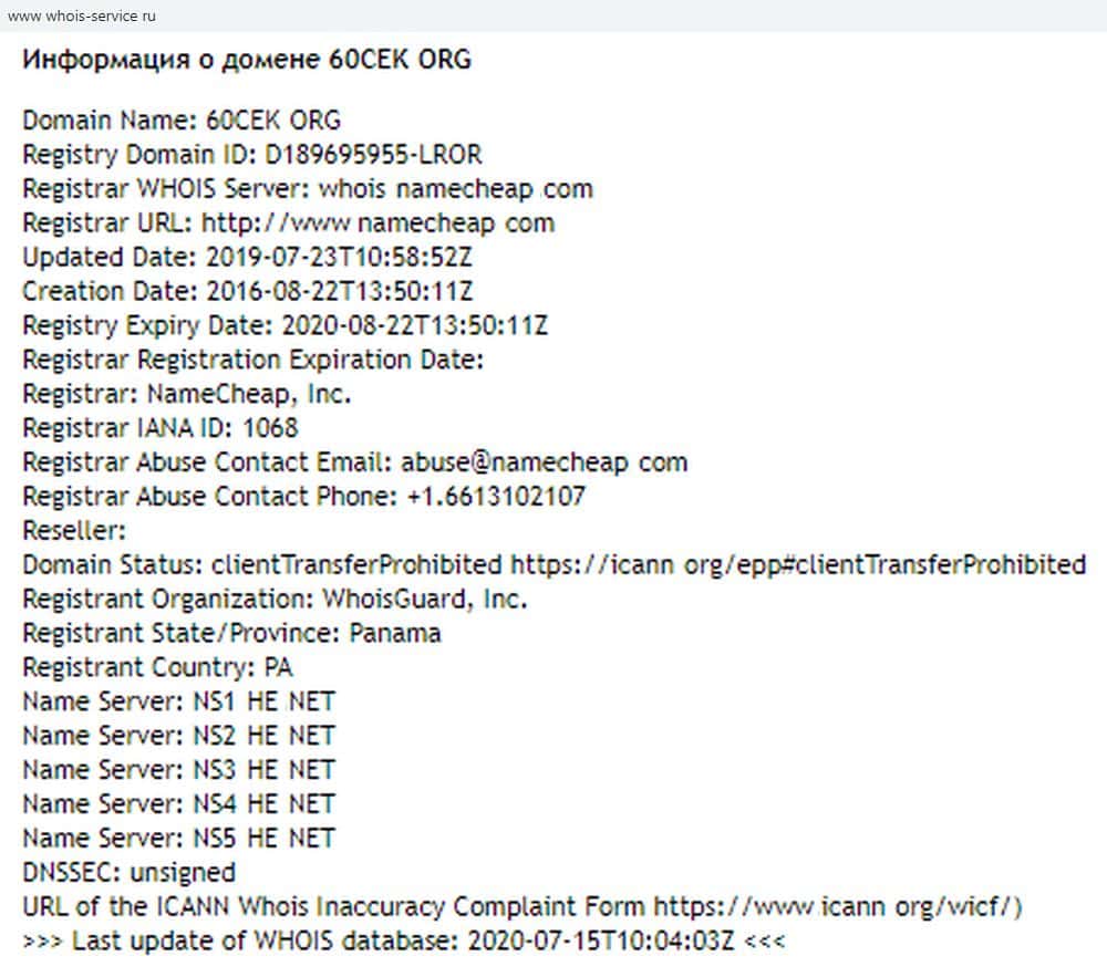 Данные о владельцах сайта шараги 60Cek Org скрыты при помощи платных сервисов. Более того, мошенники используют анонимную почту, чтобы дополнительно обезопасить себя.