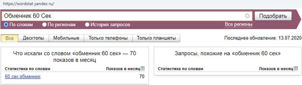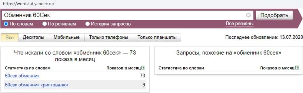 По запросу "Обменник 60Сек" та же система выдает 73 показа, еще 9 человек пытались выйти на скам-платформу жуликов Обменник 60 Сек, добавив слово "криптовалюта".