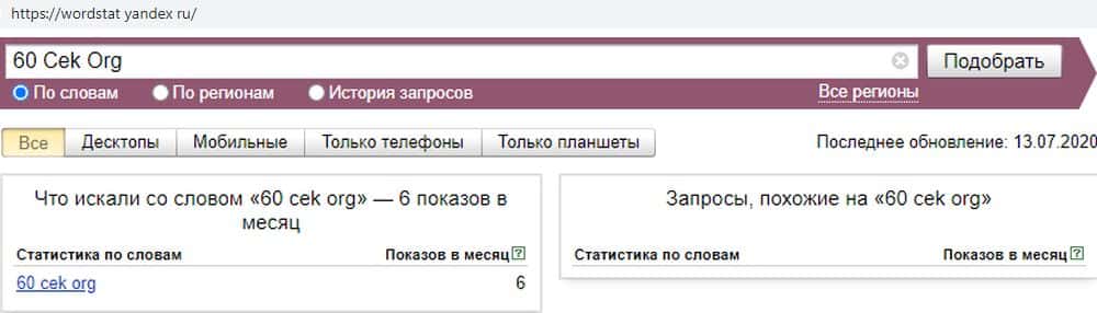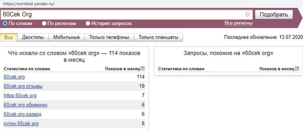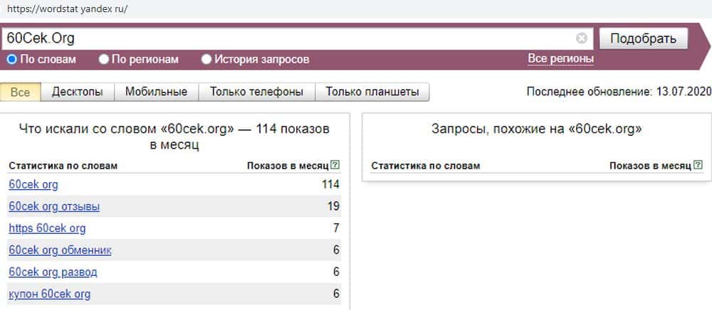Самое большое количество показов, 378, приходится на запрос "60Сек". Люди думают, что если контора на слуху, то не обманет, и продолжают набивать карманы мошенникам 60Cek Org.