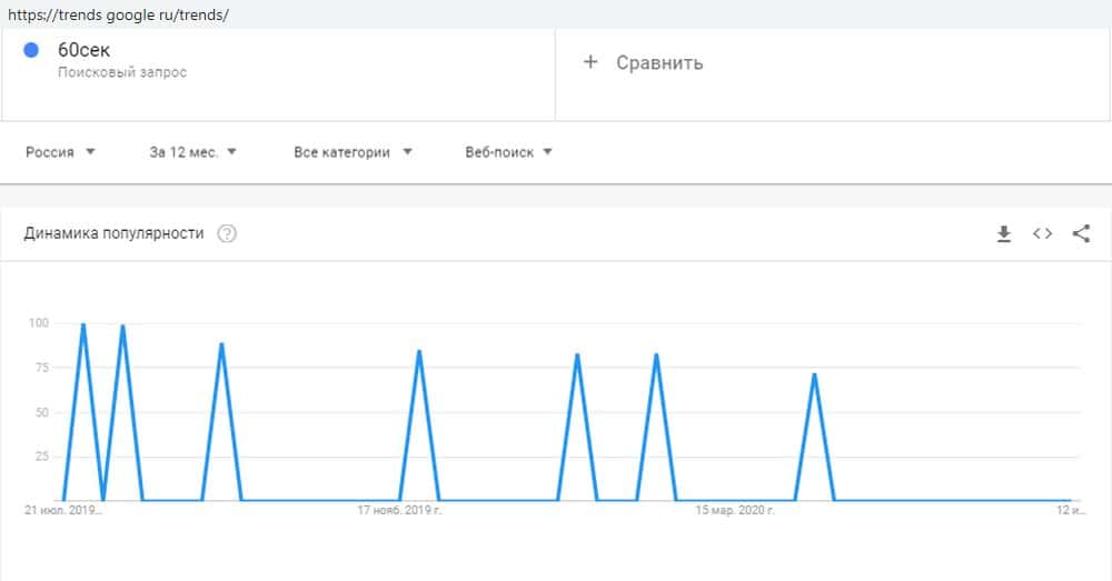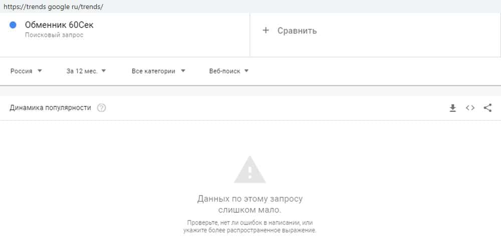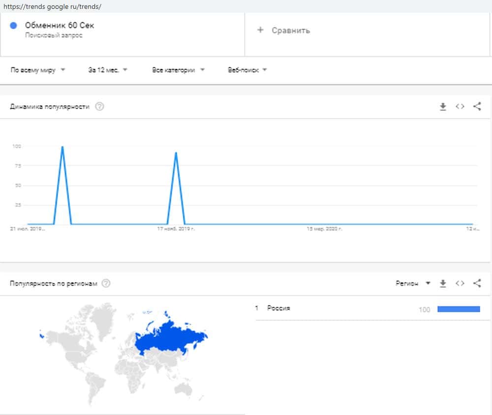 Согласно данным интернет-ресурса trends google ru, по запросу "Обменник 60 Сек" по России за последние 12 месяцев было произведено около 200 запросов.