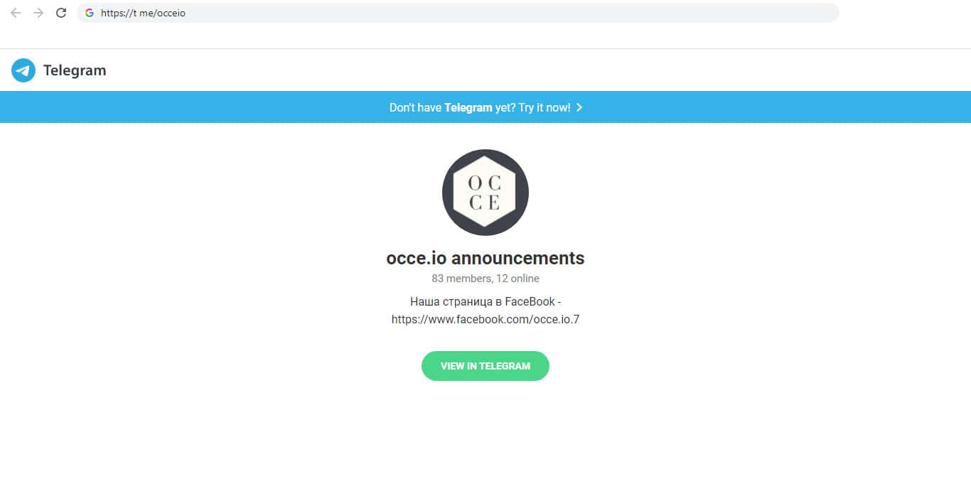 На сайте компании представлена лишь ссылка на закрытый канал в телеграмме, где фирма мошенников OCCE io собрала своих клиентов и вытягивает из них деньги. но участников не так много, всего 83 человека, из которых на момент проверки онлайн было лишь 12. Видимо компания решила выдавить все деньги из оставшихся клиентов перед своим сливом.