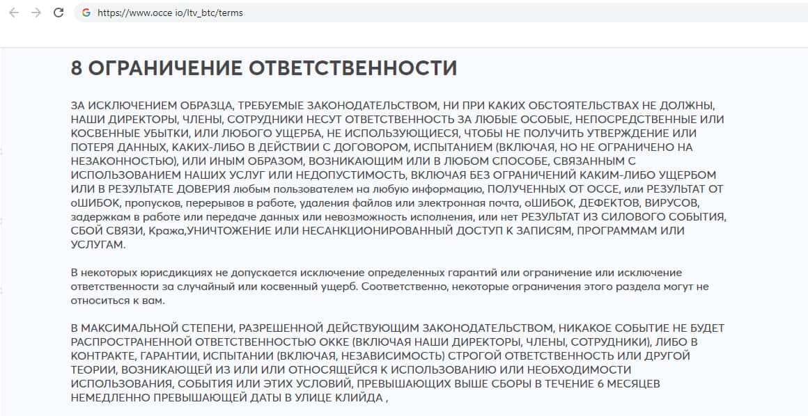 Компания кидал ОССЕ предоставила документ на своём сайте под названием "ограничение ответственности". В нём компания застраховала себя от всего, так как указала, что они не будут нести ответственность за любые действия в компании. Жулики видимо решили опять перестраховаться в выдали такой документ, по которому к ним не должно быть никаких претензий.