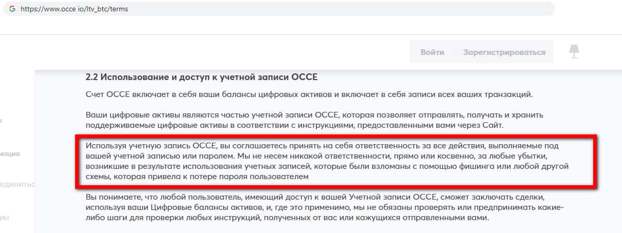 Клиентский договор с недоконторой OCCE io не представляет собой ничего особенного, кроме одного пункта, в котором фирма говорит, что клиент сам несёт ответственность за потерю средств вызванную взломом его аккаунта. то есть фирма может просто присвоить себе аккаунт клиента, забрать его деньги и сослаться на этот пункт договора, по которому они ни за что не отвечают.