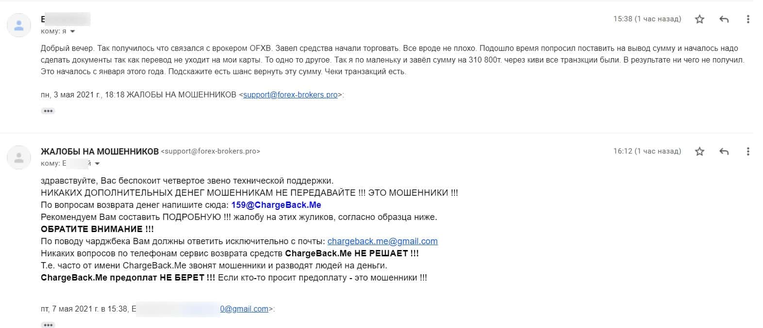 В данном разделе представлена информация от очередного обманутого интернет-пользователя, который пострадал от деятельности мошенников ОФХБ.