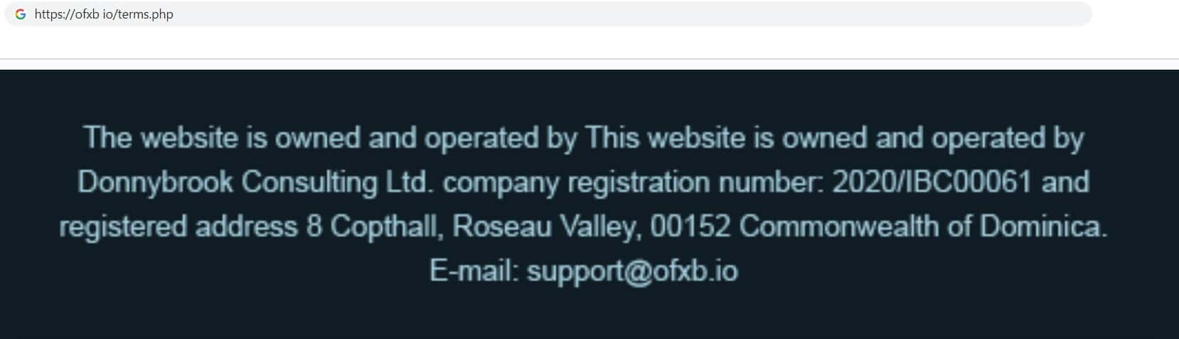 Компания жуликов OFXB io на своём главном интернет ресурсе представила пользователям информацию о юридическом лице, которым является компания Donnybrook Consulting Ltd.