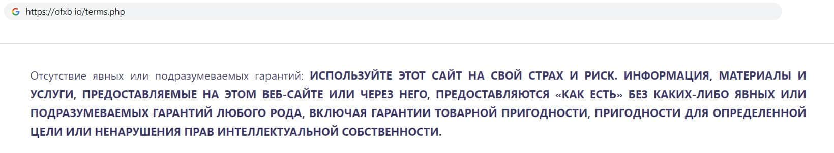 Так же фирма мошенников ОФХБ указала, что не предоставляет никаких гарантий, включая гарантии товарной пригодности. Жулики сразу отказались от всей ответственности.