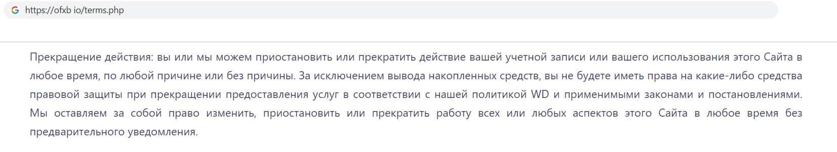 Разводилы ОФХБ представили пункт, согласно которому не только клиент может в одностороннем порядке расторгнуть контракт, но и компания, при этом без объяснения причины.