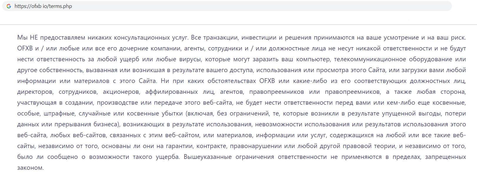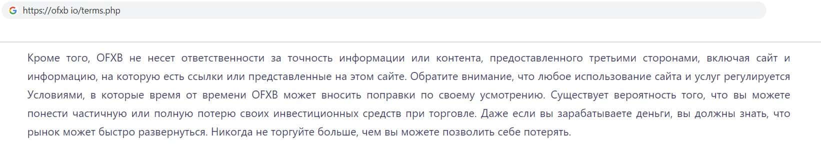 Лохотрон OFXB представил пункт в соглашении, в котором указал, что фирма не отвечает за точность информации предоставленной третьей стороной, и за ссылки на своём сайте.