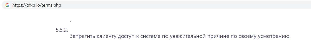 Так же фирма лохотронщиков OFXB в своём клиентском соглашении указала, что имеет полное право запретить клиенту доступ к системе по собственному усмотрению.