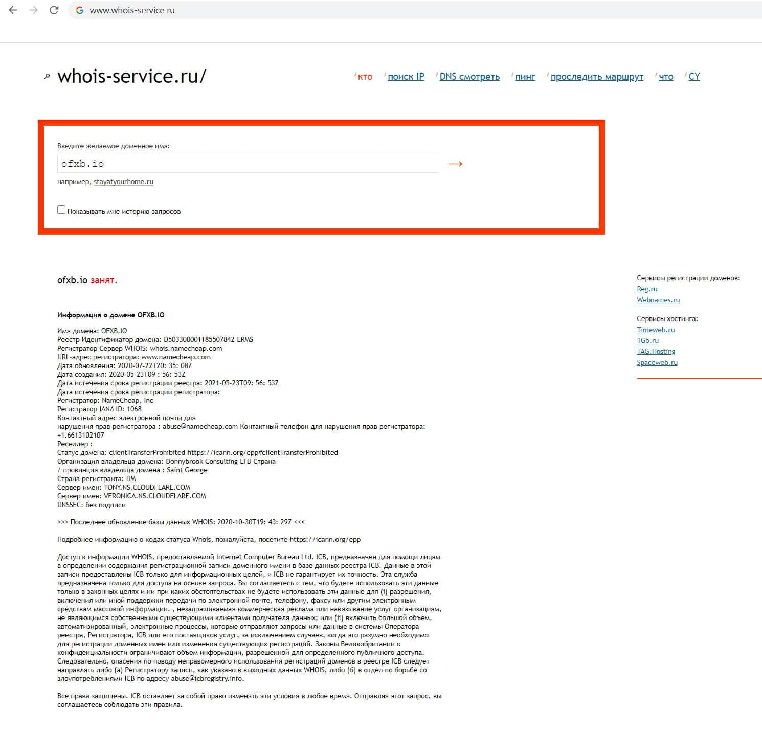Что бы узнать кто владеет доменом жуликов OFXB io мы обратились к интернет ресурсу whois-service ru. Но выяснилось, что данная организация скрывает владельца своего домена.