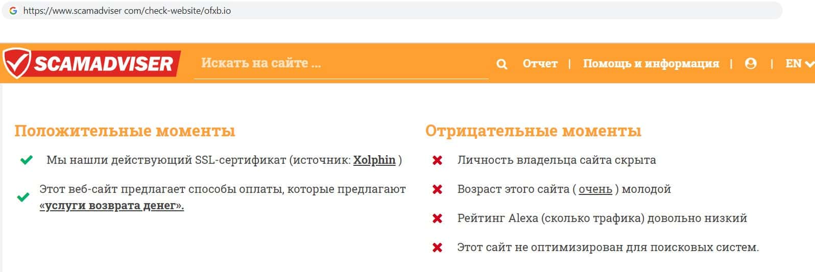 Мы проверили сайт кидал OFXB io через сайт scamadviser com. Мы выяснили, что владелец сайта скрывает свою личность, а так же сайт плохо оптимизирован к поисковым системам.