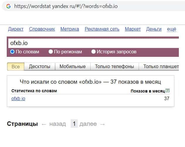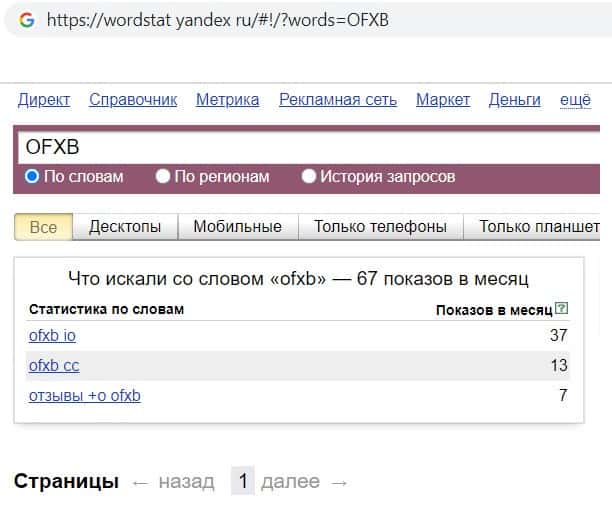Мы проверили количество запросов компании мошенников OFXB io в Яндексе по названию конторы, а именно "OFXB". Данный запрос пользователи выполнили 67 раз в течении месяца.