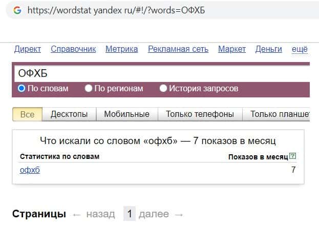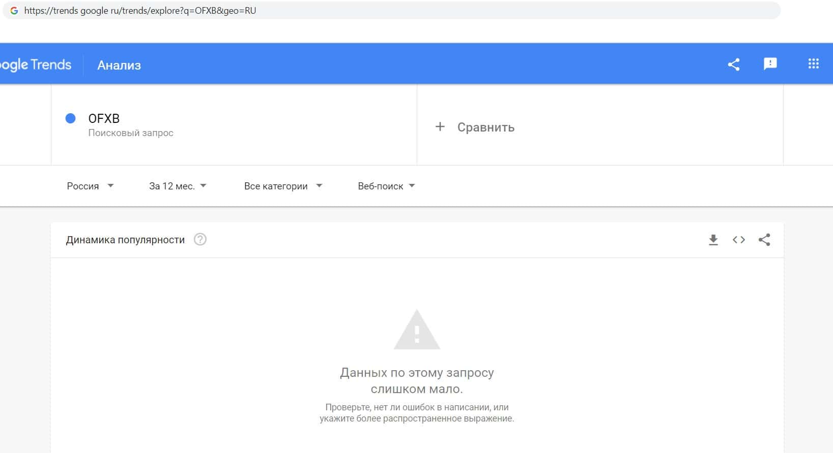 Так же мы проверили количество запросов фирмы махинаторов OFXB io по русскоязычному названию компании, а именно "ОФХБ". Данный запрос пользователи совершили всего 7 раз.