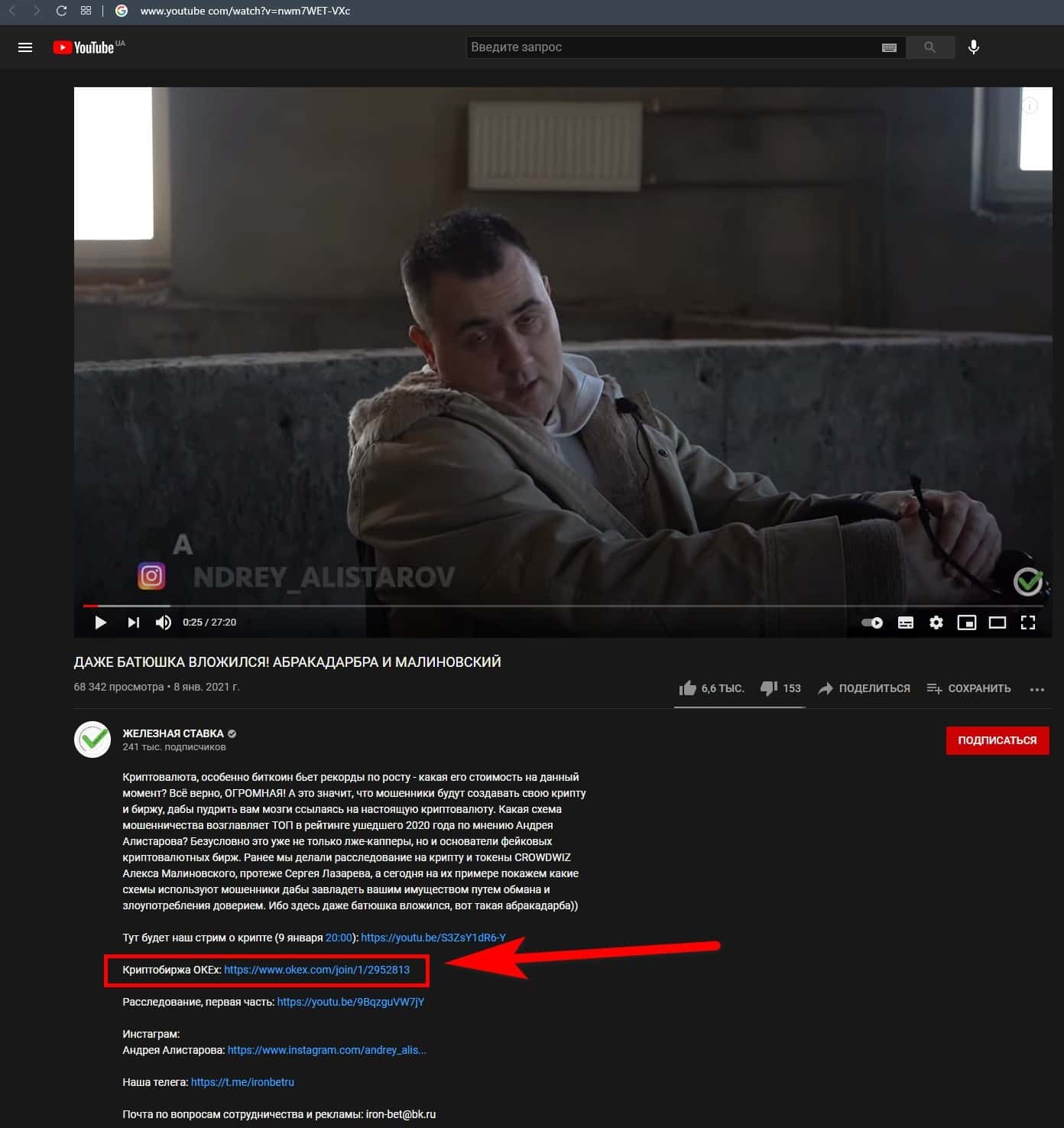 Далее вы можете увидеть скриншот видео с вышеописанного канала, где как раз в описании к нему есть рекламная ссылка на привлечение потенциальных лохов в крипто-контору ОКекс.