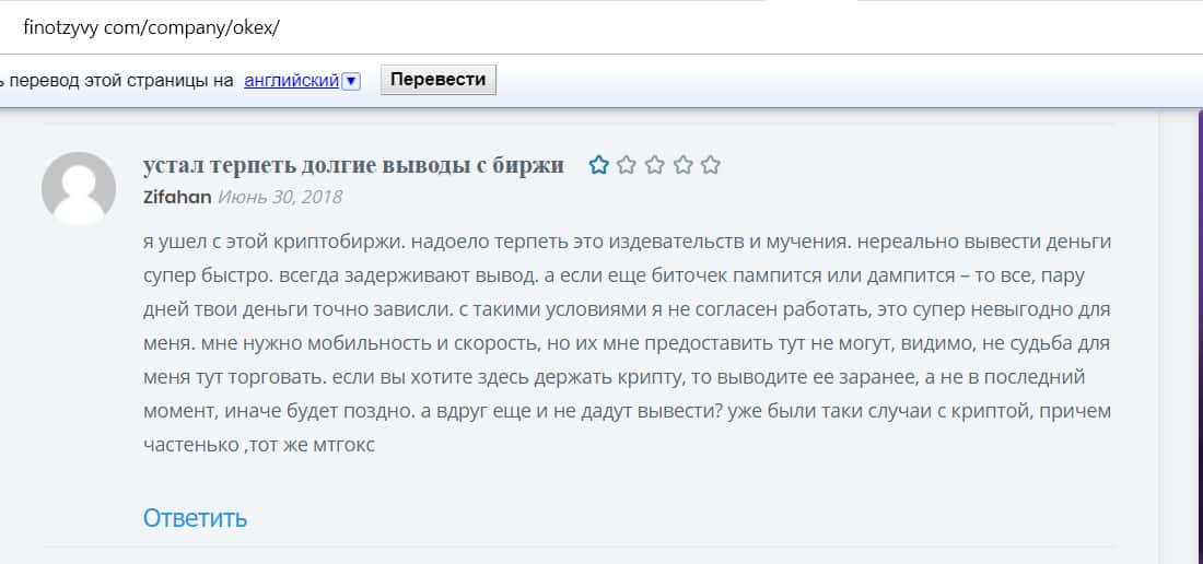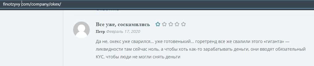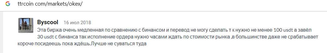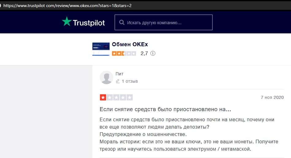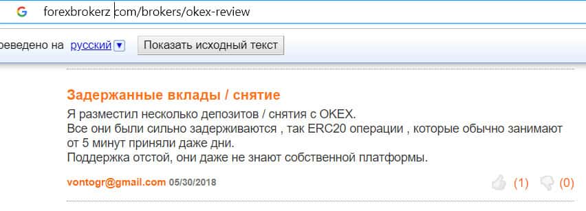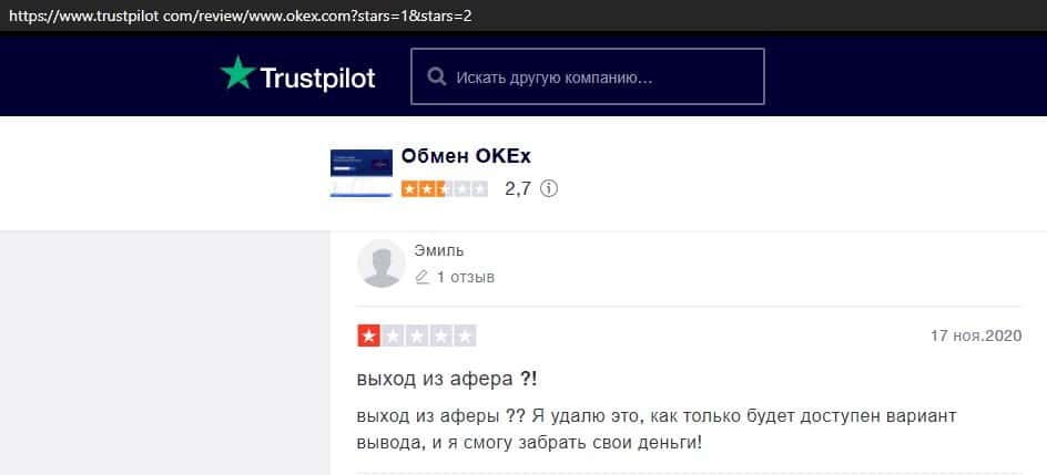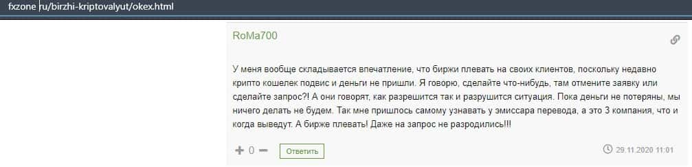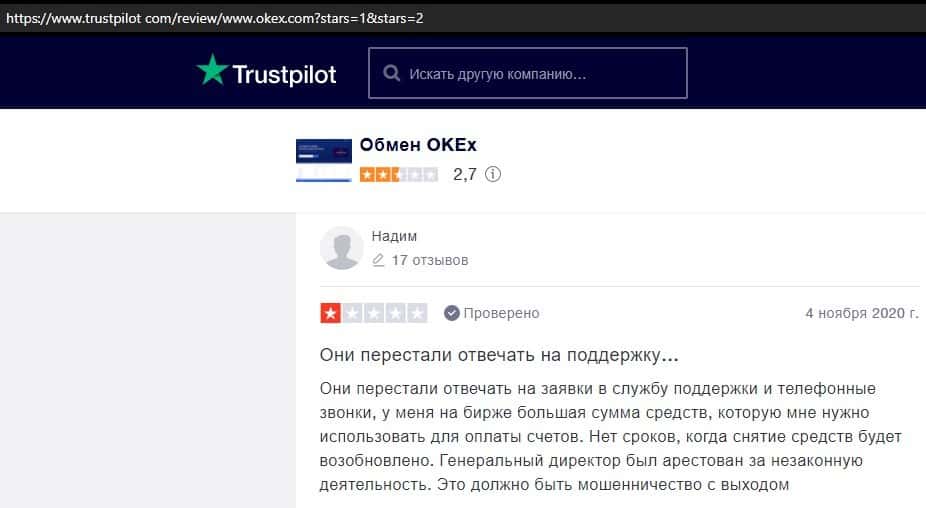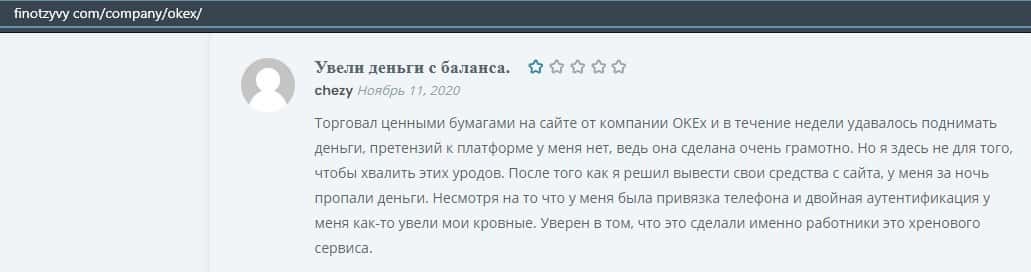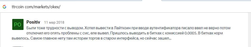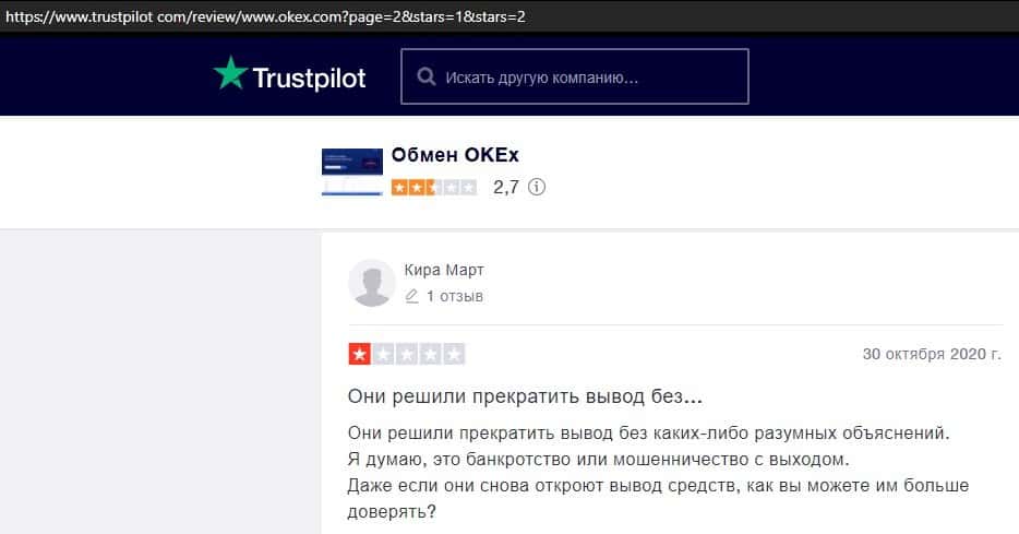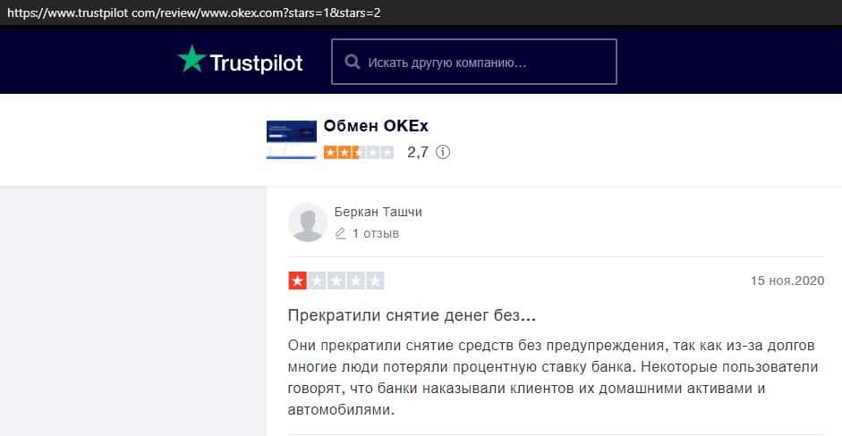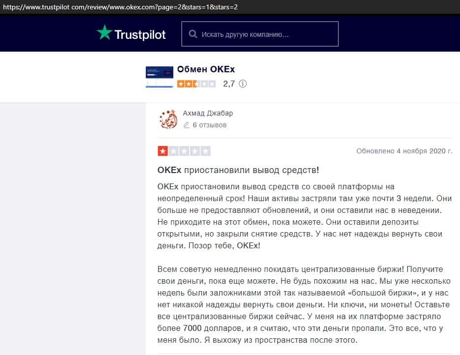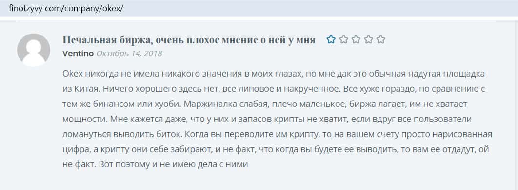 В очередном отзыве рассказывается, что контора OKEx прекратила снятие денег без какого-либо предупреждения. Некоторые пользователи рассказывают, что им так ничего и не вернули.