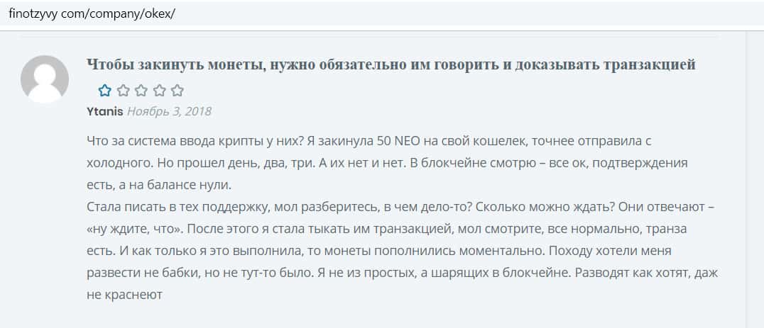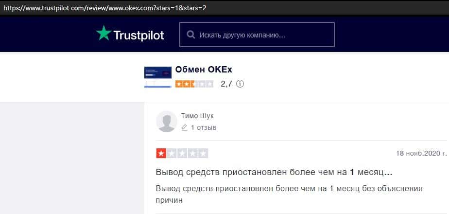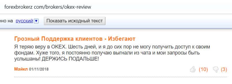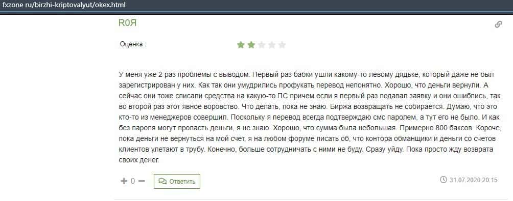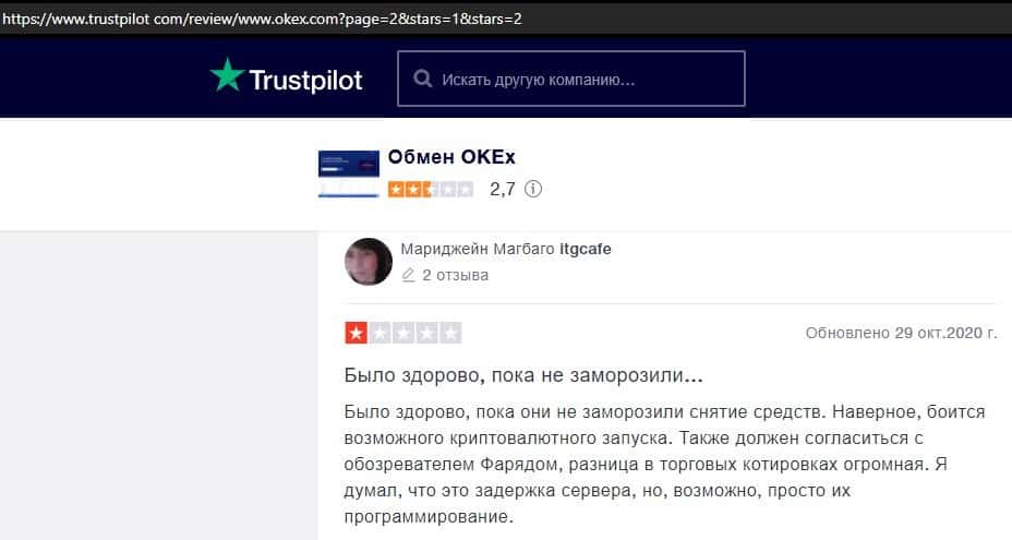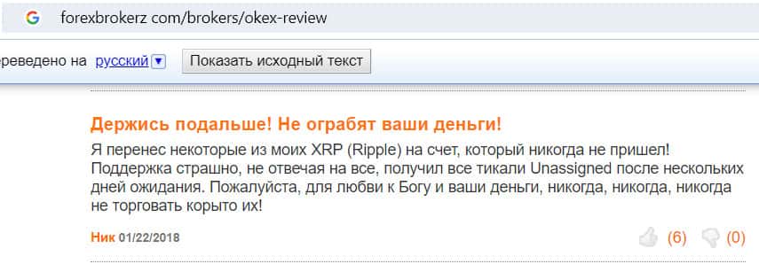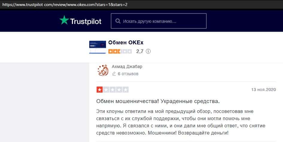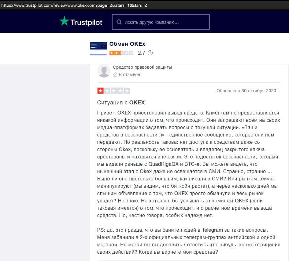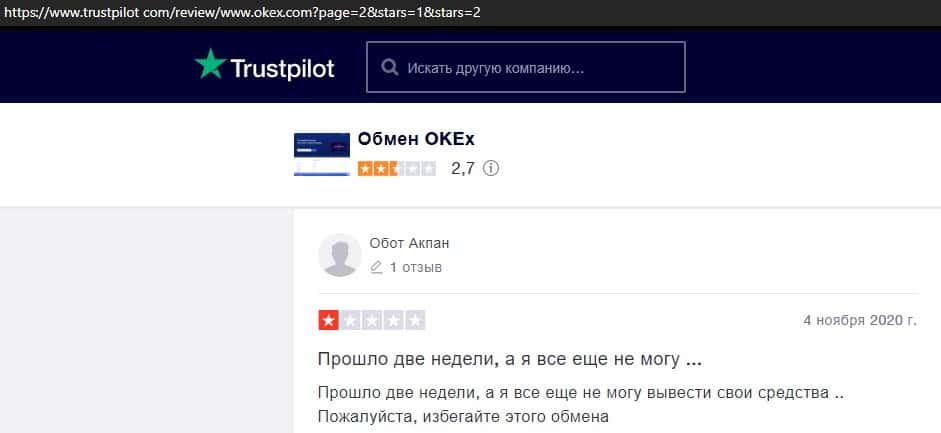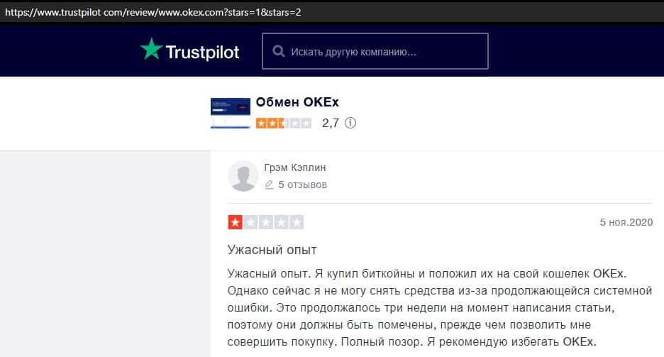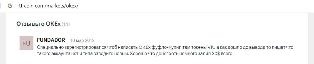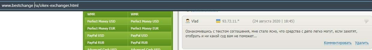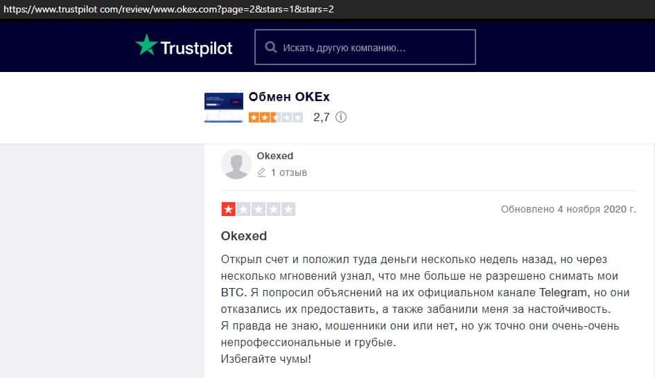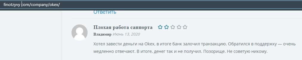 В очередном отзыве рассказывается, что контора OKEx прекратила снятие денег без какого-либо предупреждения. Некоторые пользователи рассказывают, что им так ничего и не вернули.