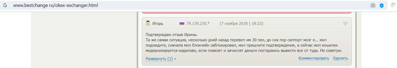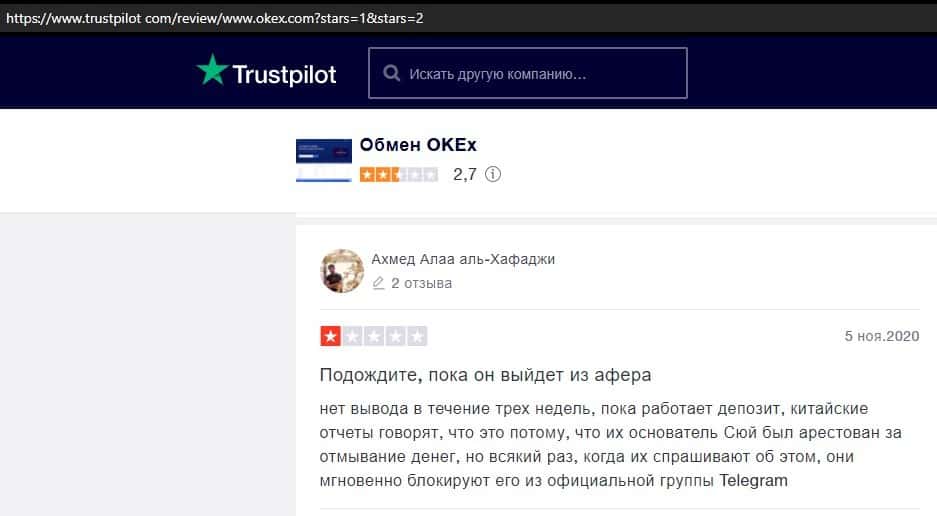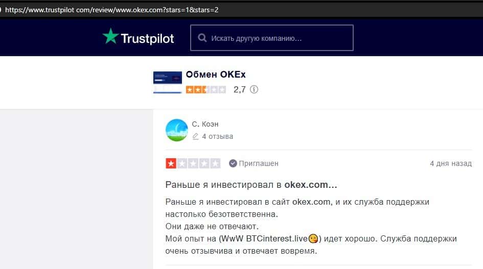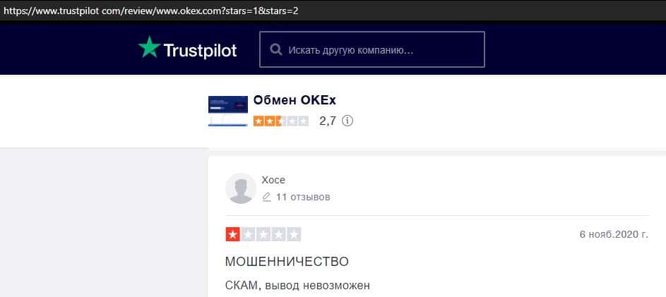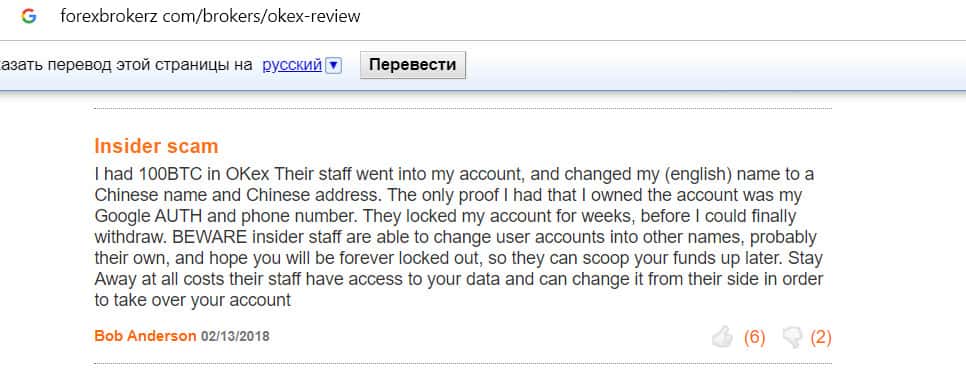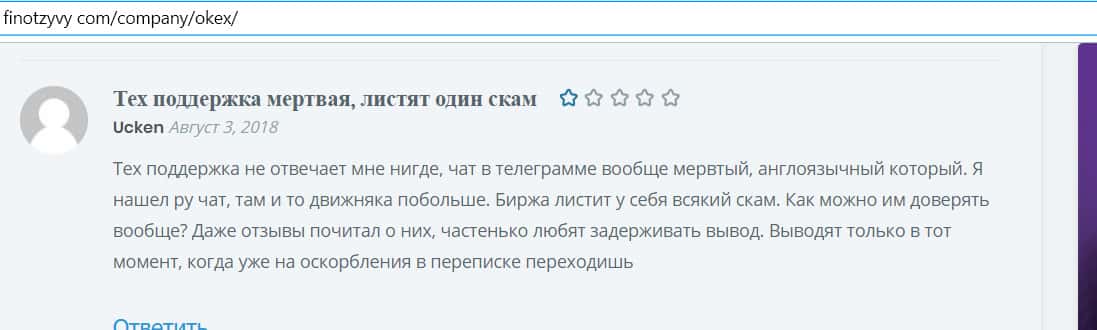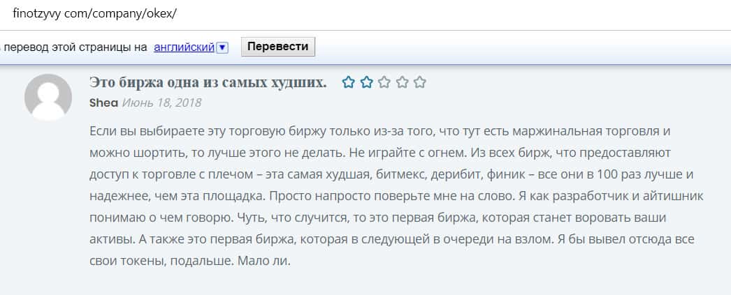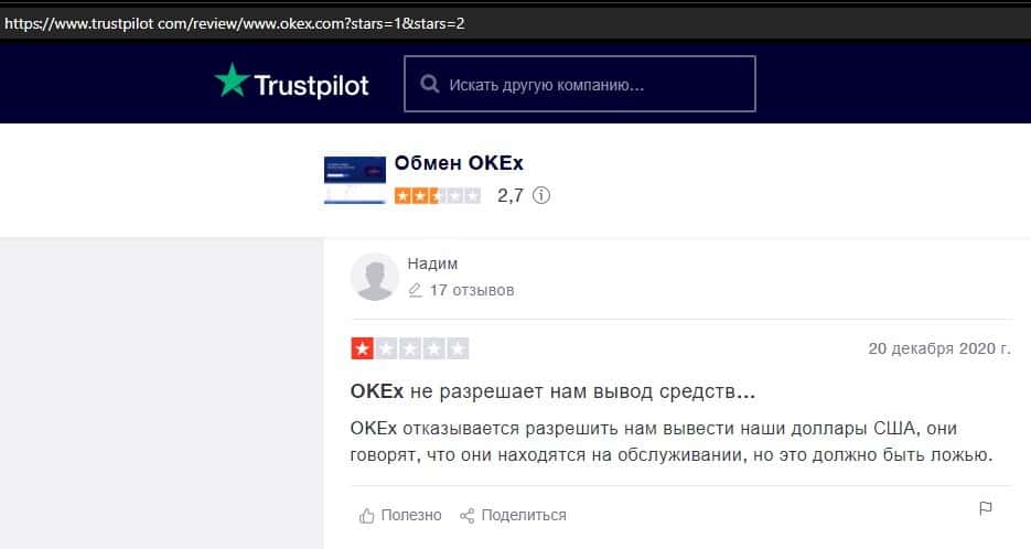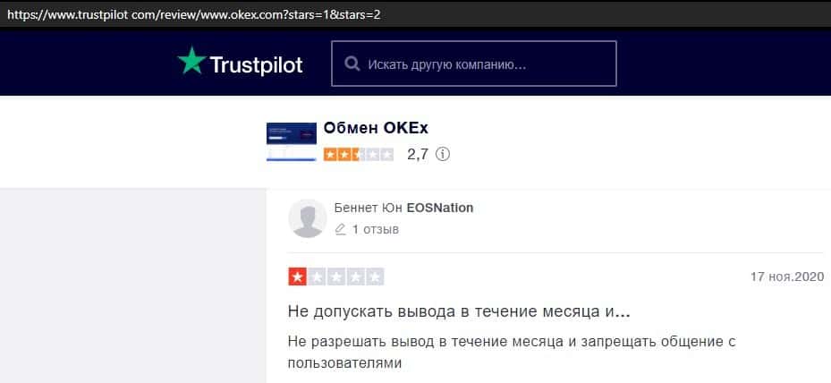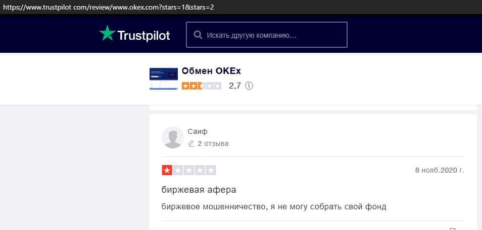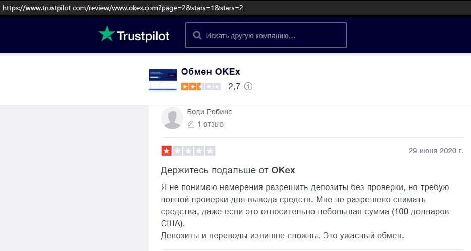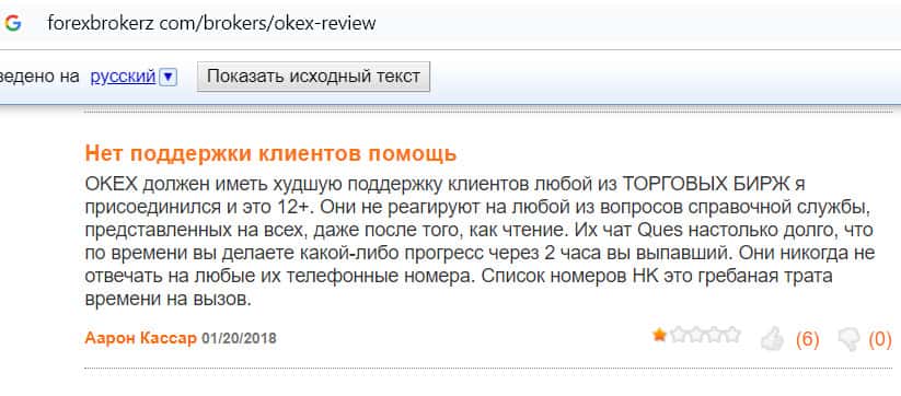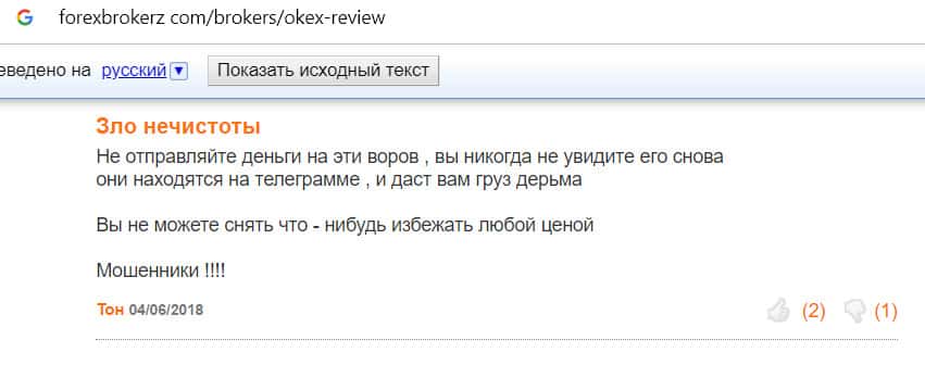 В очередном отзыве рассказывается, что контора OKEx прекратила снятие денег без какого-либо предупреждения. Некоторые пользователи рассказывают, что им так ничего и не вернули.