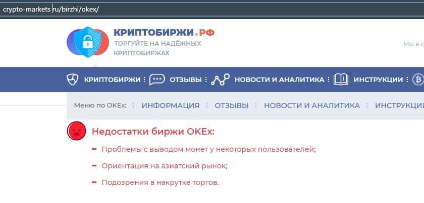 Далее представлены недостатки работы мошеннической биржи ОКекс. Там часто возникают проблемы с выводом, ориентация на азиатский рынок, а также подозрения по накрутке объемов.
